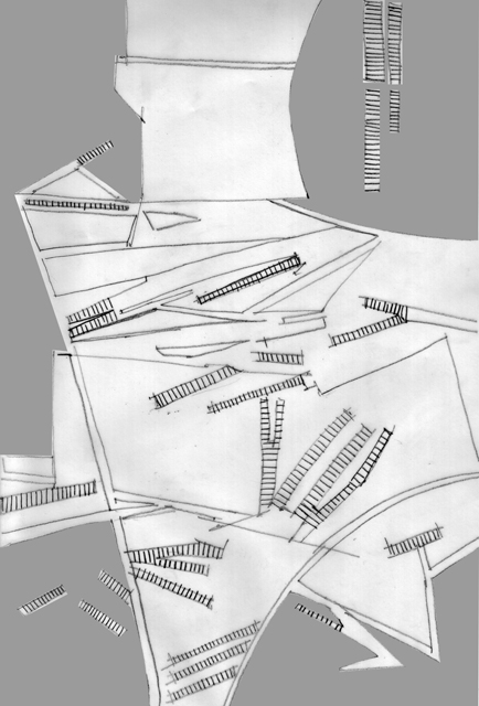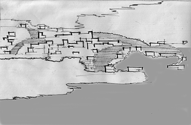 III:» Esperando la noche», sobre una superficie a un mismo nivel topográfico, se organizan estructuras lineales, que responden a una trama más o menos compleja, ofreciendo una alternativa de agrupamiento, que permite espacios abiertos sin dejar de formar un conjunto.