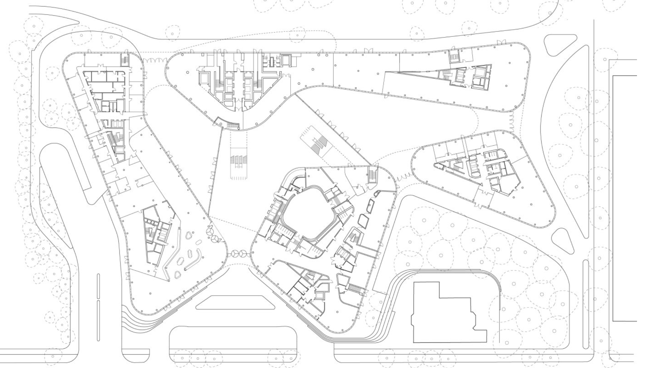 Su forma dinámica de “estrella de mar» de cinco puntas crea un patio interior de uso común con sala de conferencia y restaurante para el personal, ademas de un vestíbulo acristalado que da acceso a una circunvalación peatonal en el primer piso, liberando el patio para las actividades comunes.