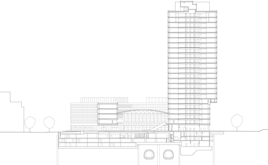 Si bien tiene forma de Estrella de mar , la implantación dentro de la cuadricula urbana se propone respondiendo a la característica de cada fachada y es así que la fachada a las vías es continua paralela a las mismas con una leve curvatura, con la torre de dieciocho pisos de oficinas sobre ese lado norte resaltando la existencia de las vías y se genera una barrera verde que la separa de las mismas.